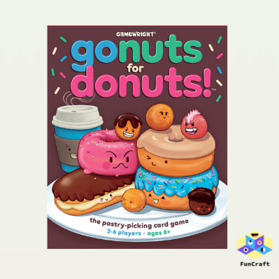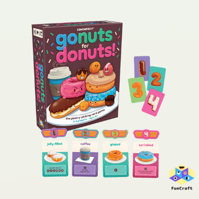 Time to take the donuts! A tray of tempting treats awaits your bid in this freshly baked card game. Will you go for a stellar cruller or grab a glorious glazed? A double chocolate is sure to score, but in the long run Boston cream may be worth more! Choose carefully - if two or more players go for the same donut, nobody gets it! End with the highest score and victory will taste sweet!