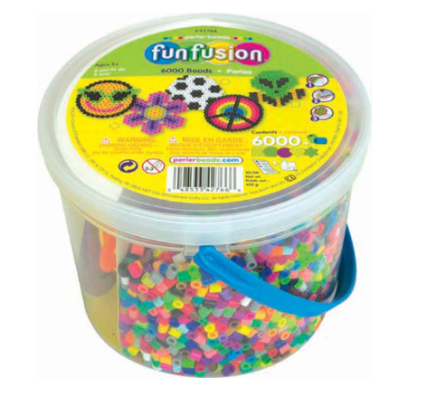 The 6000 Bead Bucket from Perler with 5 reusable pegboards will really engage children's creativity! For ages 6 and up. This Perler fuse bead bucket includes 6000 beads, a small square pegboard, a small circle pegboard, a small hexagon pegboard, a small star pegboard, small heart pegboard, ironing paper, and easy instructions. The bead colors in this bucket are white, yellow, orange, red, bubblegum, purple, dark blue, light blue, dark green, light green, brown, grey, black, clear, light brown, tan, neon yellow, neon orange, neon green, neon pink, pastel green, pastel lavender, cheddar, toothpaste, hot coral, plum, kiwi lime, turquoise, blush, and pink.