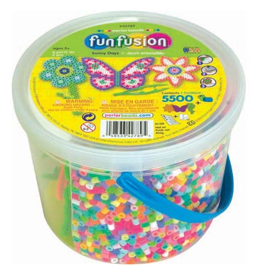 Perler's Sunny Days Activity Bucket featuring a variety of reusable pegboards will keep kids busy for hours! For ages 6 and up. This Perler Sunny Days fuse bead bucket includes 5500 beads, 3 pegboards (butterfly, flower, and daisy), Bead Tweezer Plus, ironing paper, and easy instructions. Bead colors include white, bubblegum, light green, magenta, neon yellow, neon orange, neon green, neon pink, pastel blue, pastel lavender, pastel yellow, cheddar, toothpaste, kiwi lime, blush, periwinkle blue, and light pink.