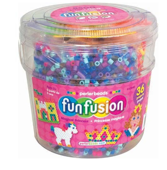 Kids can enjoy fairytale fun with the Perler Magical Princess Activity Bucket and its reusable pegboards! For ages 6 and up. This Perler Magical Princess fuse bead bucket includes 8500 beads, 3 pegboards (small square, small star, and pony), ironing paper, and easy instructions. Bead colors include light blue, brown, black, magenta, blue glitter, purple glitter, pastel lavender, toothpaste, plum, white, yellow, peach, pastel yellow, cheddar, hot coral, kiwi lime, blush, bubblegum, light green, light pink, pink, raspberry, and parrot green.