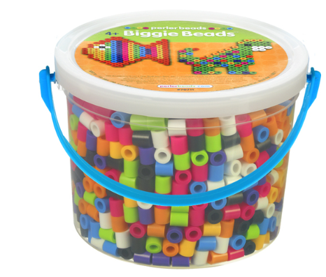 Perfect for little hands, Perler Biggie Beads (larger than our classic-size beads) help young children develop color identification and fine motor skills. Designed for use with Biggie Beads pegboards only (not included), the Perler Biggie Beads Bucket includes 1200 Biggie Beads in a rainbow of 8 colors—magenta, orange, cheddar, kiwi lime, light blue, purple, black, and white—plus ironing paper. The pegboard and ironing paper can be used over and over again. Ages 4 and up. Watch our video for a quick guide on how to fuse Biggie Beads.
